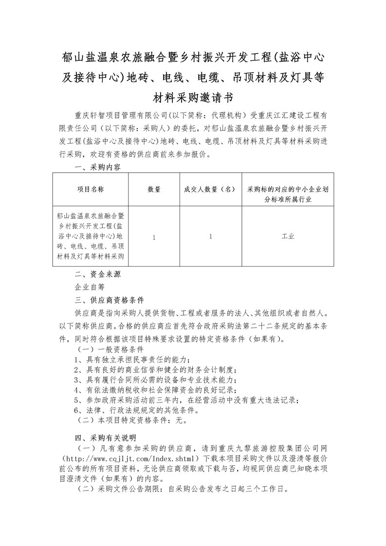 郁山鹽溫泉農(nóng)旅融合暨鄉(xiāng)村振興開發(fā)工程(鹽浴中心及接待中心)地磚、電線、電纜、吊頂材料及燈具等材料采購采購邀請書