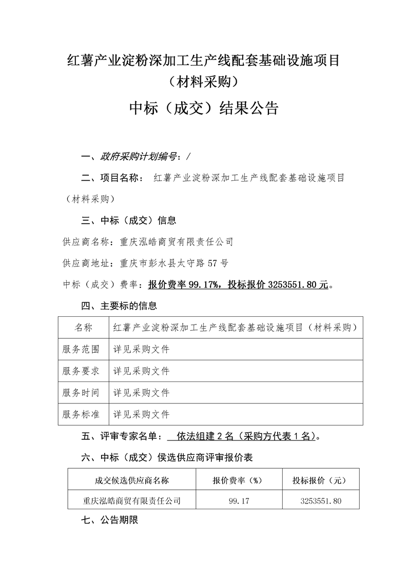 紅薯產(chǎn)業(yè)淀粉深加工生產(chǎn)線配套基礎(chǔ)設(shè)施項(xiàng)目(材料采購(gòu))中標(biāo)(成交)結(jié)果公告
